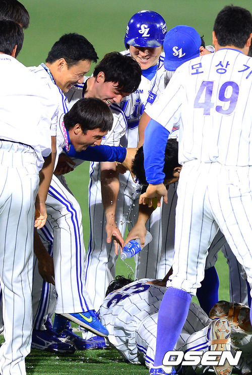 9회말 끝내기 안타를 날린 삼성 박한이가 동료들의 축하를 받고 있다. / soul1014@osen.co.kr