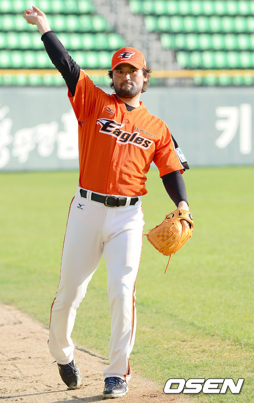 25일 오후 서울 잠실야구장에서 열린 '2012 팔도 프로야구' 두산 베어스와 한화 이글스의 경기에 앞서 한화 박찬호가 훈련을 하고 있다.
