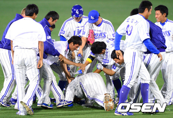 삼성 라이온즈의 사자들이 시즌 첫 끝내기의 기쁨을 짓궂은 구타(?)로 표현했다.