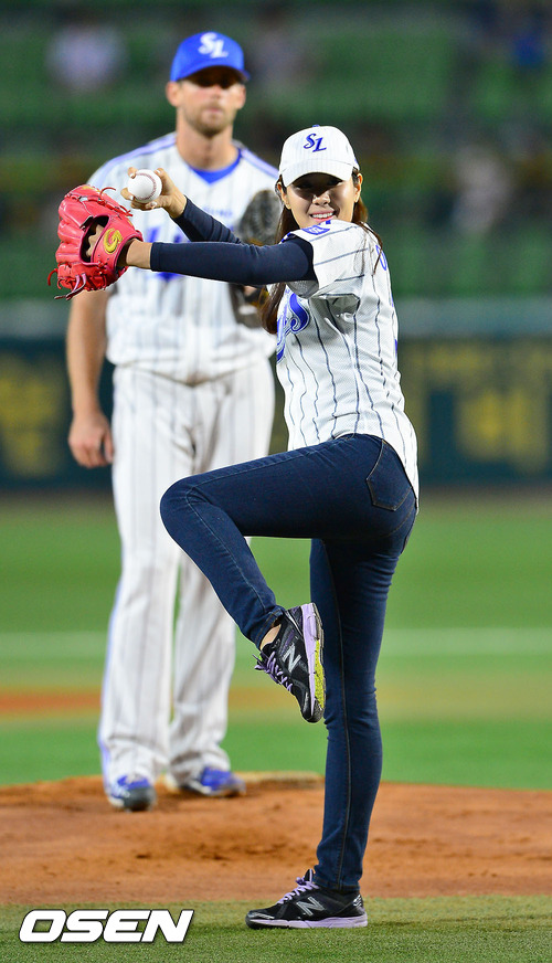 25일 오후 대구구장에서 열린 '2012 팔도 프로야구' 삼성 라이온즈와 KIA 타이거즈의 경기 전 2012 미스코리아 미 김나연이 시구를 하고 있다.