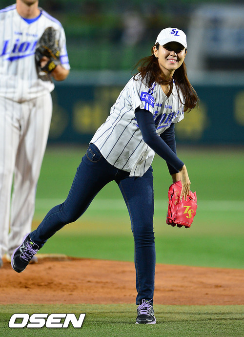 25일 오후 대구구장에서 열린 '2012 팔도 프로야구' 삼성 라이온즈와 KIA 타이거즈의 경기 전 2012 미스코리아 미 김나연이 시구를 하고 있다.