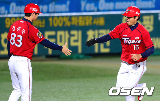 26일 오후 대구구장에서 열린 '2012 팔도 프로야구' 삼성 라이온즈와 KIA 타이거즈의 경기 4회초 2사 KIA 조영훈이 선취 솔로홈런을 날리고 김종국 코치와 하이파이브를 하고 있다