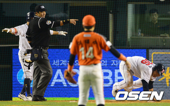 26일 오후 서울 잠실구장에서 열린 '2012 팔도 프로야구' 두산 베어스와 한화 이글스의 경기, 6회말 2사 1,2루에서 두산 오재일이 최주환의 적시타에 한화 박노민의 태그를 피해 홈에서 세이프되고 있다.