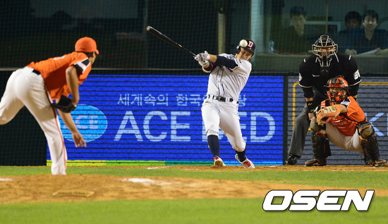 26일 오후 서울 잠실구장에서 열린 '2012 팔도 프로야구' 두산 베어스와 한화 이글스의 경기, 6회말 2사 1,2루에서 두산 최주환이 1타점 적시타를 날리고 있다.