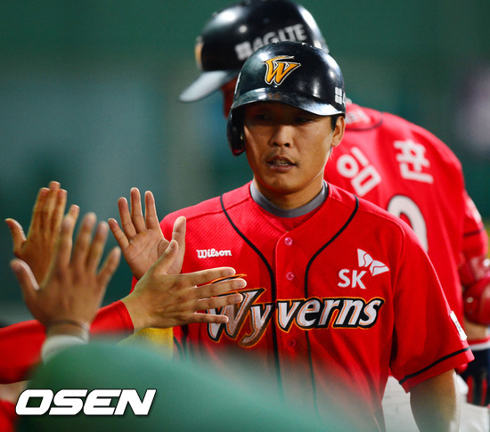 26일 오후 서울 목동구장에서 열린 '2012 팔도 프로야구' 넥센 히어로즈와 SK 와이번스의 경기에서 9회초 1사 주자 1,2루 SK 이호준의 좌익수 앞 1타점 적시타때 홈을 밟은 조동화가 덕아웃에서 동료들과 하이파이브를 하고 있다.