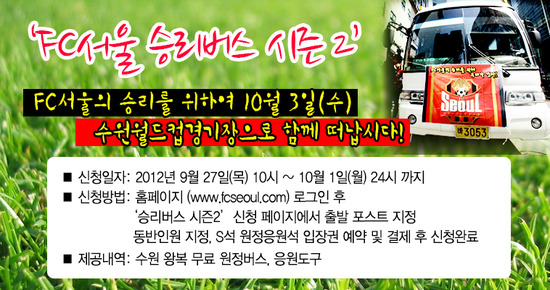 FC 서울이 오는 10월 3일 수원 월드컵경기장에서 열리는 수원과 원정경기에 함께할 대규모 '승리버스 시즌2' 원정단을 모집한다.