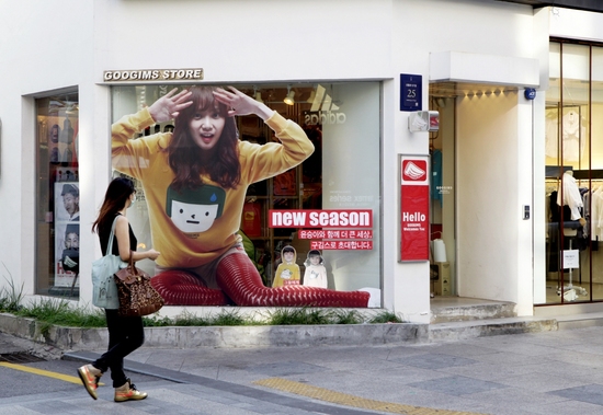 서울 압구정 로데오거리에 있는 의류 브랜드 '구김스'의 오프라인 매장 쇼윈도를 장식한 사진 속 윤승아는 마치 귀여운 걸리버 소녀가 쇼 윈도우에서 호기심 어린 표정으로 바깥 세상을 구경하는 듯이 재미있는 표정을 짓고 있다.