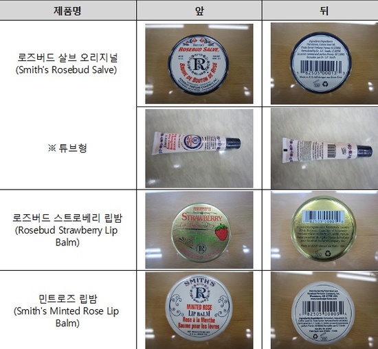 회수 대상 제품은 미국 Case Mason Filling. Inc에서 제조(수출사 Rosebud Perfume company. Inc)한 ‘로즈버드 살브 오리지널(Smith's Rosebud Salve)’, ‘로즈버드 스트로베리 립밤(Rosebud Strawberry Lip Balm)’ 및 ‘민트로즈 립밤(Smith's Minted Rose Lip Balm)’ 등 3개 제품이다.