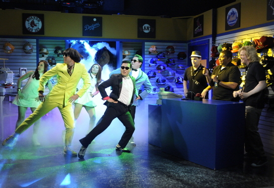 인기 크루로 활동중인 바비 모이니핸, 빌 헤이더, 테런 킬럼이 각각 싸이와 노홍철, 유재석 역할을 맡아 ‘강남스타일’ 뮤직비디오 속 노홍철의 저질댄스와 말춤을 보여주며 흥을 돋웠다. 이어 ‘터보’ 버전이 시작되자 실제 싸이가 등장해 이들과 함께 원조 말춤과 뚱한 ‘싸이표’ 표정 연기를 천연덕스럽게 선보이며 폭발적인 환호를 받는다.
