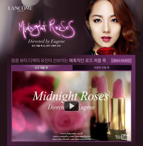 로즈 퍼플 룩 영상은 랑콤의 가을 메이크업 ‘미드나잇 로즈(Midnight Roses)’ 컬렉션을 활용한 것. 유진은 영상을 통해 파운데이션으로 깨끗한 피부표현 후 퍼플 컬러의 아이라이너로 눈매를 살짝 강조하고 로즈 퍼플과 라일락 핑크 컬러 립스틱을 활용해 입술에 포인트를 주는 여성스럽고 매혹적인 가을 메이크업 방법을 추천했다.