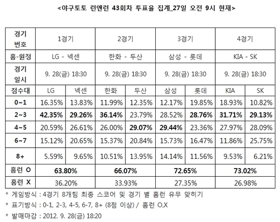 국민체육진흥공단(www.kspo.or.kr)이 발행하는 체육진흥투표권 수탁사업자인 스포츠토토 공식 온라인 발매 사이트 베트맨(www.betman.co.kr)이 9월 28일(금) 오후6시30분 열리는 2012 프로야구 4경기 8개팀 대상으로 한 야구토토 런앤런 43회차 투표율을 중간집계한 결과, 참가자들의 대다수인 72.02%는 KIA-SK(4경기)전에서 홈런이 나올 것으로 예상했다고 밝혔다.