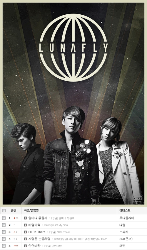 걸그룹 브라운아이드걸스의 소속사 내가네트워크가 론칭한 3인조 남성그룹 루나플라이(LUNAFLY)가 27일 음원 공개 후 음원차트 실시간 순위 1위에 올랐다.