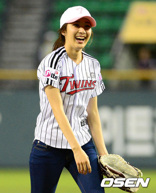 27일 오후 서울 잠실야구장에서 열린 '2012 팔도 프로야구' LG 트윈스와 넥센 히어로즈의 경기에 앞서 XTM 인윤정 아나운서가 시구를 마치고 환하게 웃고 있다.
