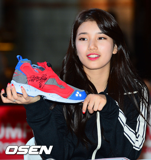 27일 오후 6시 서울 여의도 IFC 몰에서 열린 리복의 모델인 수지, 우영, 택연의 팬 사인회에서 자신이 사인한 운동화를 들어보이고 있다.