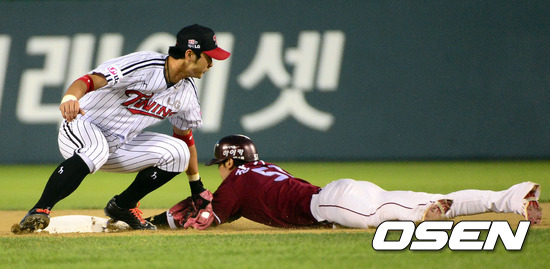 27일 오후 서울 잠실야구장에서 열린 '2012 팔도 프로야구' LG 트윈스와 넥센 히어로즈의 경기, 1회초 1사 1루 넥센 강정호 타석때 1루주자 장기영이 도루에 성공하고 있다.