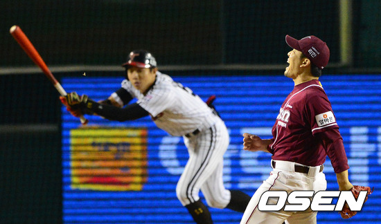 27일 오후 서울 잠실야구장에서 열린 '2012 팔도 프로야구' LG 트윈스와 넥센 히어로즈의 경기, 6회말 1사 2,3루 넥센 김병현이 LG 이대형에게 우전 2타점 적시타를 허용하며 아쉬운 표정을 짓고 있다.