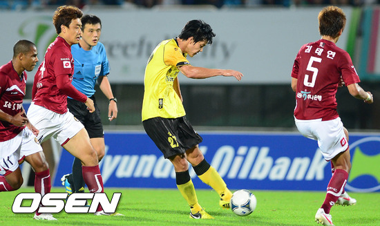 27일 오후 대전 한밭종합운동장에서 열린 '현대오일뱅크 K리그 2012' 대전 시티즌과 전남 드래곤즈의 경기 후반 양준아가 슈팅을 하고 있다.