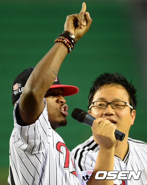28일 오후 서울 잠실구장에서 열린 '2012 팔도 프로야구' LG 트윈스와 넥센 히어로즈의 경기, 경기에 앞서 시구자로 나선 세계적인 팝스타 니요가 팬들에게 인사를 하고 있다.