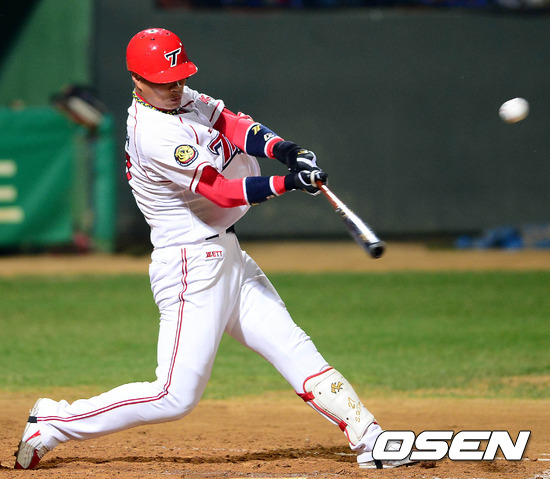 28일 오후 광주 무등구장에서 열린 '2012 팔도 프로야구' KIA 타이거즈와 SK 와이번스의 경기 3회말 2사 1,2루 김상현이 1타점 적시타를 치고 있다.