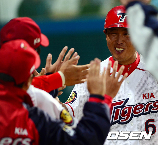 28일 오후 광주 무등구장에서 열린 '2012 팔도 프로야구' KIA 타이거즈와 SK 와이번스의 경기 4회말 1사 1,2루 김선빈의 1타점 적시타에 홈을 밟은 2루주자 박기남이 덕아웃에서 동료들과 하이파이브를 하고 있다.
