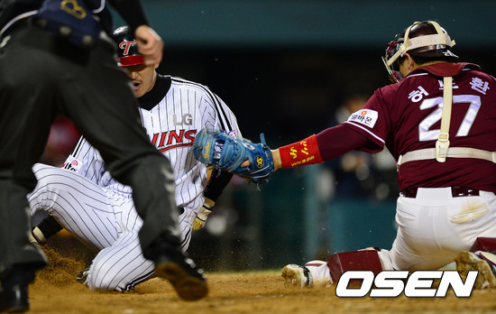 28일 오후 서울 잠실구장에서 열린 '2012 팔도 프로야구' LG 트윈스와 넥센 히어로즈의 경기, 7회말 무사 2루에서 LG 박용택이 이병규의 적시 2루타에 홈에서 슬라이딩 하였지만 넥센 허도환에 태그아웃당하고 있다.