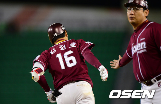 28일 오후 서울 잠실구장에서 열린 '2012 팔도 프로야구' LG 트윈스와 넥센 히어로즈의 경기, 8회초 1사에서 넥센 강정호가 솔로포를 날리고 심재학 코치와 하이파이브를 하며 그라운드를 돌고 있다.