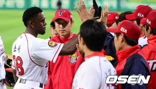 28일 오후 광주 무등구장에서 열린 '2012 팔도 프로야구' KIA 타이거즈와 SK 와이번스의 경기 8회초를 마친 소사가 덕아웃으로 향하며 동료들과 하이파이브를 하고 있다.