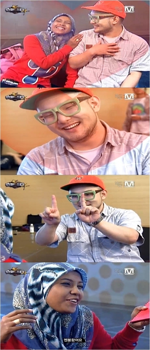 ‘슈퍼스타K4’ 참가자 계범주가 라이벌 푸트리 노리자의 애교에 배시시 웃음을 보였다.