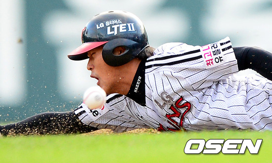 추석 연휴 첫날인 29일 오후 서울 잠실구장에서 열린 '2012 팔도 프로야구' LG 트윈스와 두산 베어스의 경기, 2회말 2사에서 LG 정주현이 2루 도루를 시도하고 있다. 정주현은 도루 성공