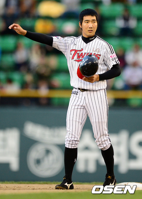 추석 연휴 첫날인 29일 오후 서울 잠실구장에서 열린 '2012 팔도 프로야구' LG 트윈스와 두산 베어스의 경기, 3회말 1사 3루에서 LG 최영진이 1타점 적시 2루타를 날리고 타임을 외치고 있다.