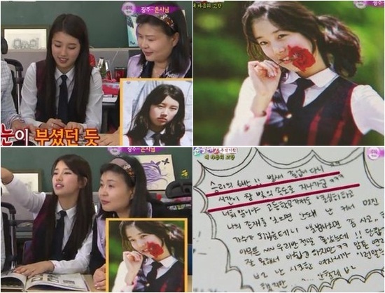 29일 오후 방송된 KBS 2TV 예능프로그램 '청춘불패2'에서는 '내 마음의 고향'이란 제목으로 추석기획이 공개된 가운데, 수지는 설레는 마음을 안고 자주 찾지 못했던 고향 광주로 향했다. 이 곳에서 수지는 중학교 은사를 찾아 뜻깊은 시간을 가졌고, 졸업사진과 생활기록부도 공개됐다.