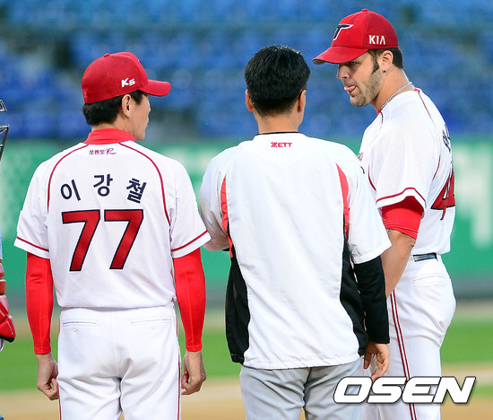 29일 오후 광주 무등구장에서 열린 '2012 팔도 프로야구' KIA 타이거즈와 SK 와이번스의 경기 4회초 1사 1,3루 조인성에게 1타점 2루타를 내준 앤서니가 이강철 코치와 이야기를 나누고 있다.