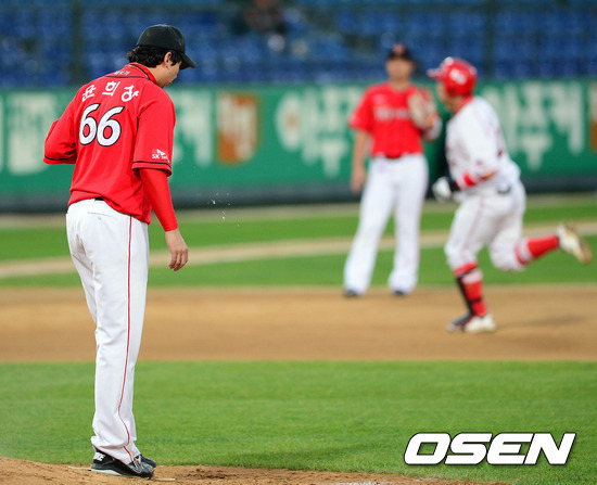 29일 오후 광주 무등구장에서 열린 '2012 팔도 프로야구' KIA 타이거즈와 SK 와이번스의 경기 4회말 선두타자 나지완에게 솔로포를 내준 윤희상이 마운드에서 침을 뱉고 있다.