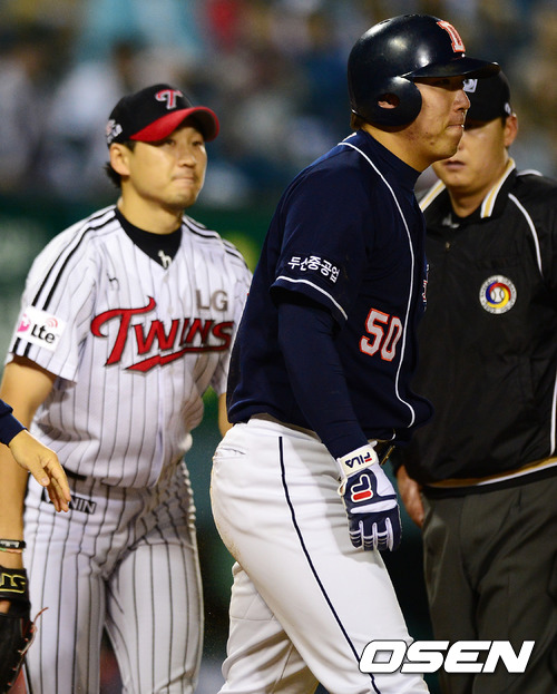 추석 연휴 첫날인 29일 오후 서울 잠실구장에서 열린 '2012 팔도 프로야구' LG 트윈스와 두산 베어스의 경기, 6회초 무사에서 두산 김현수가 LG 신재웅의 사구에 괴로워하며 1루로 향하고 있다.