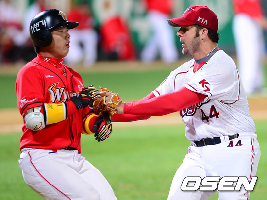 29일 오후 광주 무등구장에서 열린 '2012 팔도 프로야구' KIA 타이거즈와 SK 와이번스의 경기 7회초 1사 1루 박재상의 희생번트 타구를 잡은 앤서니가 직접 태그아웃 시키고 있다.