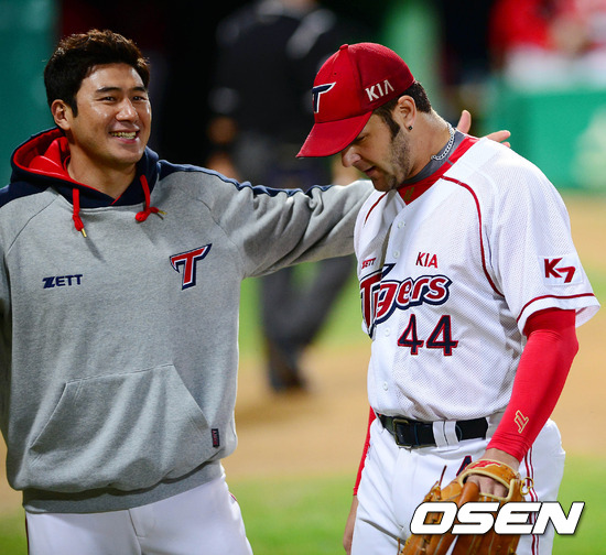 29일 오후 광주 무등구장에서 열린 '2012 팔도 프로야구' KIA 타이거즈와 SK 와이번스의 경기 7회초를 마친 앤서니가 덕아웃으로 향하며 서재응의 격려를 받고 있다.