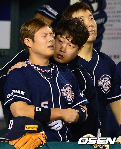 추석 연휴 첫날인 29일 오후 서울 잠실구장에서 열린 '2012 팔도 프로야구' LG 트윈스와 두산 베어스의 경기, 9회초 두산 양의지가 윤석민의 어깨를 만지며 이야기를 나누고 있다.