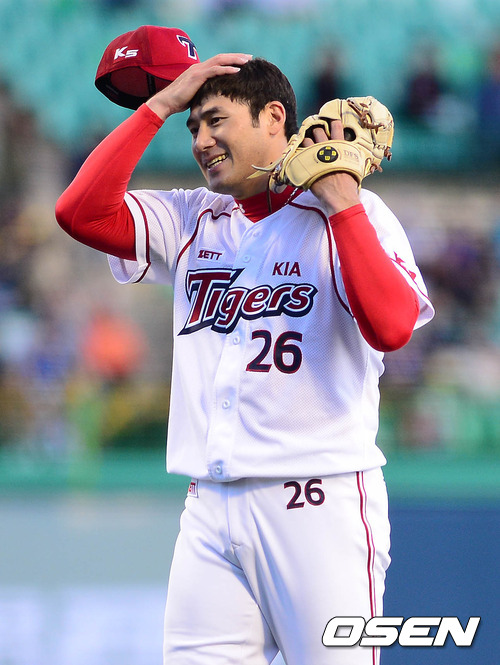30일 오후 군산 월명종합운동장 야구장에서 열린 '2012 팔도 프로야구' KIA 타이거즈와 롯데 자이언츠의 경기 4회초 2사 1루 홍성흔의 타석, 서재응이 공을 바꿔 달라며 구심에게 요청을 하며 미소를 짓고 있다.
