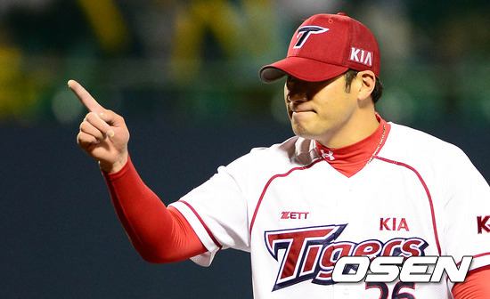 30일 오후 군산 월명종합운동장 야구장에서 열린 '2012 팔도 프로야구' KIA 타이거즈와 롯데 자이언츠의 경기 7회초 2사 1,2루 조성환을 뜬공으로 처리한 서재응이 포수 김상훈을 가리키며 기뻐하고 있다.