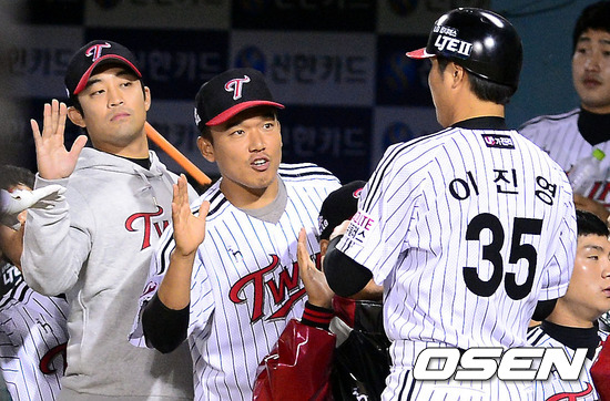 30일 오후 서울 잠실구장에서 열린 '2012 팔도 프로야구' LG 트윈스와 두산 베어스의 경기, 5회말 2사 만루 LG 이진영이 김용의가 적시타로 홈을 밟은뒤 더그아웃에서 윤요섭, 정의윤과 하이파이브를 하고 있다.