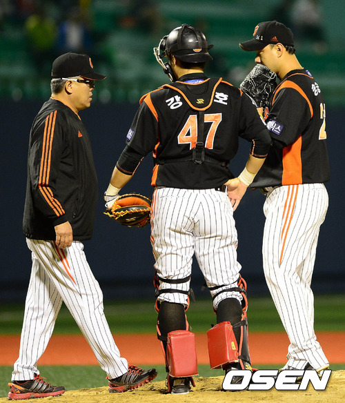 30일 오후 군산 월명종합운동장 야구장에서 열린 '2012 팔도 프로야구' KIA 타이거즈와 롯데 자이언츠의 경기 7회말 1사 송승준이 양승호 감독과 이야기를 나누고 있다.