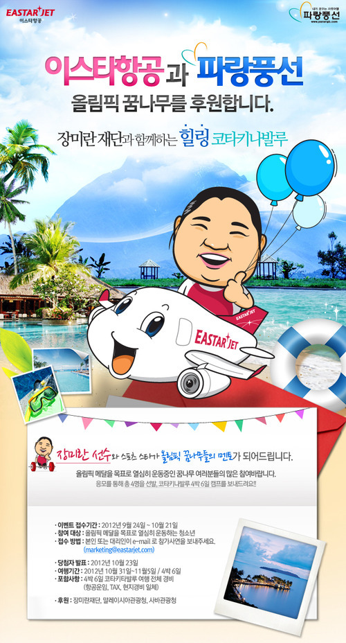 이스타항공과 파랑풍선은 런던올림픽에서 최고의 성적을 거둔 대한민국 선수들의 지속적인 육성과 발전을 위해 장미란 재단과 함께 말레이시아 최고 휴양지인 코타키나발루에서 올림픽 꿈나무 멘토링 캠프를 연다. 이번 캠프에는 대한민국을 대표하는 스포츠스타 장미란을 포함한 4명의 선수가 멘토로 참가하여 1:1 매칭으로 올림픽 꿈나무들에게 용기와 희망을 주기 위한 다양한 프로그램을 진행한다.