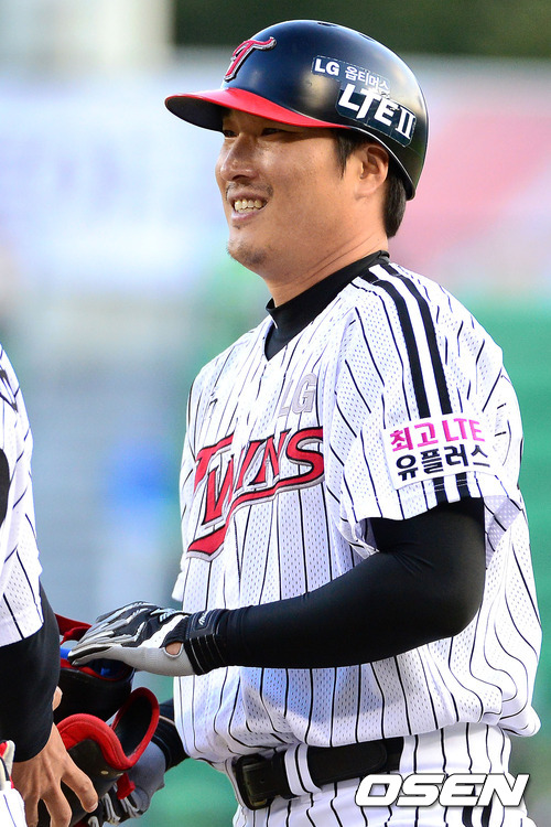 1일 오후 서울 잠실야구장에서 열린 '2012 팔도 프로야구' LG 트윈스와 삼성 라이온즈의 경기, 1회말 무사 LG 이진영이 우전안타를 치고 환하게 웃고 있다. 이진영은 개인통산 1500안타를 기록했다.