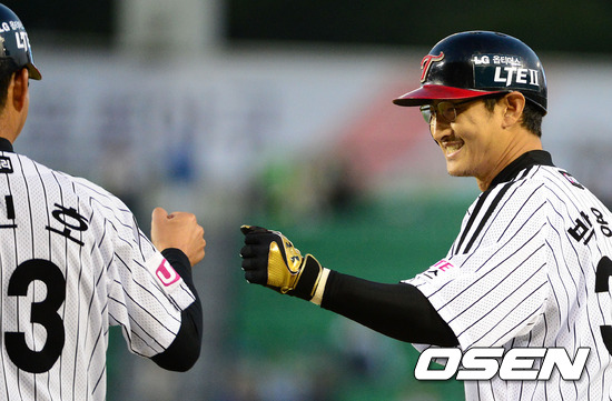 1일 오후 서울 잠실야구장에서 열린 '2012 팔도 프로야구' LG 트윈스와 삼성 라이온즈의 경기, 3회말 2사 2,3루 LG 박용택이 우전 2타점 적시타를 치고 김인호 코치와 하이파이브를 하고 있다.