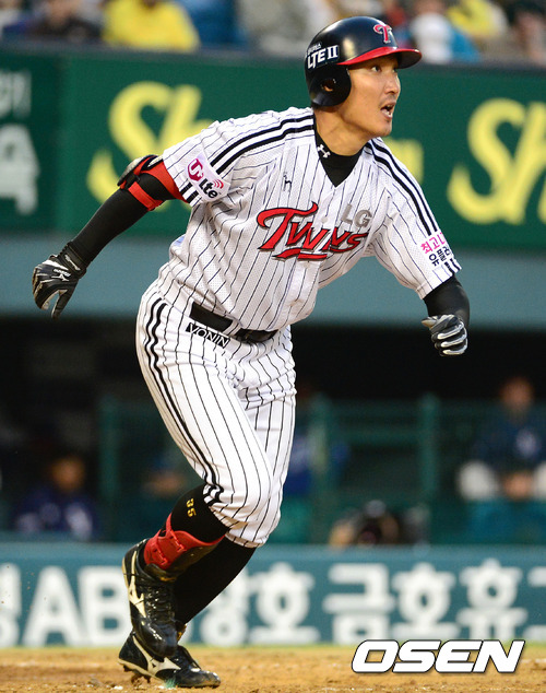 1일 오후 서울 잠실야구장에서 열린 '2012 팔도 프로야구' LG 트윈스와 삼성 라이온즈의 경기, 3회말 2사 1루 LG 이진영이 우전안타를 치고 타구를 바라보고 있다.