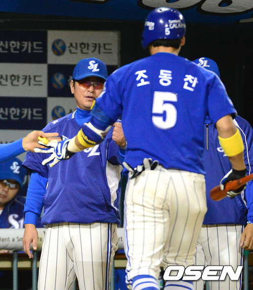 1일 오후 서울 잠실야구장에서 열린 '2012 팔도 프로야구' LG 트윈스와 삼성 라이온즈의 경기, 8회초 2사 삼성 류중일 감독이 중월 솔로홈런을 치고 더그아웃으로 오는 조동찬을 축하하고있다.