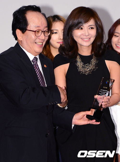 2일 오전 서울 삼성동 코엑스에서 진행된 'K-Food 수출 홍보대사 위촉식'행사 에서 장서희가 서규용 농림수산식품부장관으로부터 위촉패를 전달받고 기념촬영을 하고 있다.