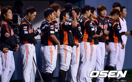 2일 오후 전북 군산구장에서 열린 2012 팔도 프로야구 KIA 타이거즈와 롯데 자이언츠의 경기 전 롯데 선수들이 어두운 표정으로 국민의례를 하고 있다.