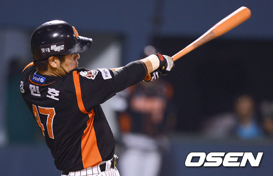 2일 오후 전북 군산구장에서 열린 2012 팔도 프로야구 KIA 타이거즈와 롯데 자이언츠의 경기 4회초 2사 2루 롯데 강민호가 1타점 적시타를 날리고 있다.