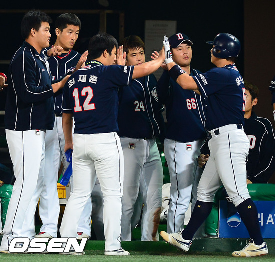 2일 오후 서울 목동구장에서 열린 '2012 팔도 프로야구' 넥센 히어로즈와 두산 베어스의 경기에서 3회초 1사 주자 없는 상황에서 두산 윤석민이 좌월 솔로 홈런을 날린 후 덕아웃에서 동료들과 하이파이브를 하고 있다.
